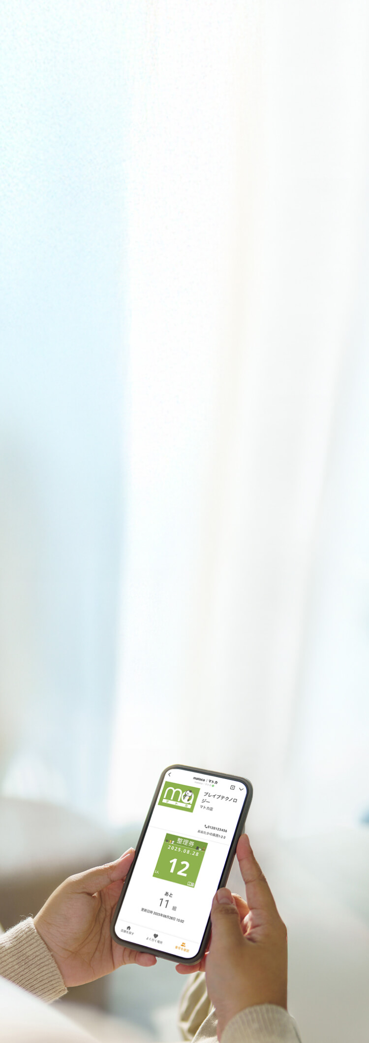 店舗専用QRコードを読み込み、matocaミニアプリを開きます。お客様ご自身で発券してもらうスタイル。